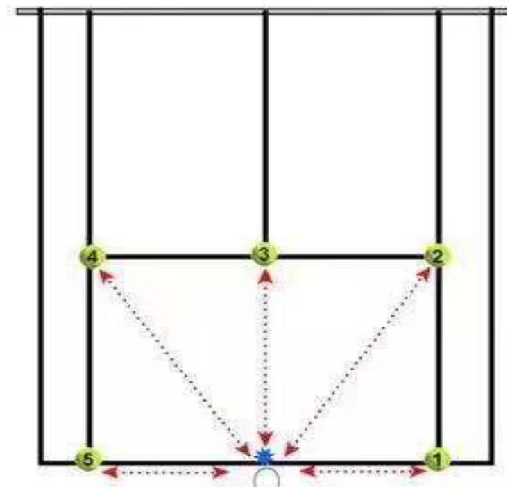 (三)扇形跑(20 分) 1.测试方法:将一支球拍放在底线中点后面,拍头指向球网,5 个球 的位置如图所示。沿着逆时针方向依次取回 5 个球,将每次取回的球 放在球拍拍面上。测试员喊‘预备-开始’之后,秒表计时开始,记 录完成时间。