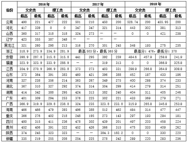 历年分数线 2016—2018年各省本科录取分数统计表: