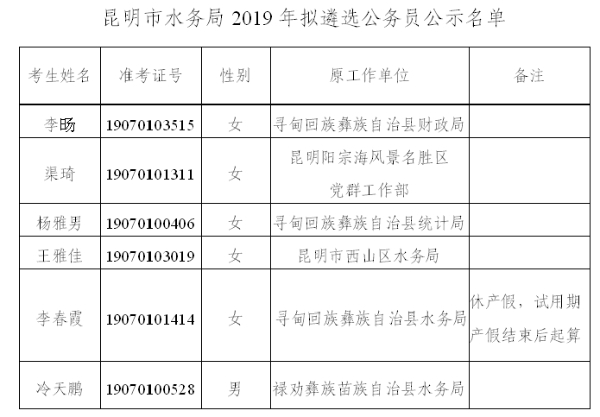 根据《昆明市2019年市级机关公开遴选公务员(参公管理人员)公告》有关规定,经笔试、面试、考察和体检等程序,昆明市水务局拟遴选李旸等6名同志,现进行公示。人选情况见附件。