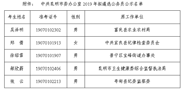 根据《昆明市2019年市级机关公开遴选公务员(参公管理人员)公告》有关规定,经笔试、面试、考察和体检等程序,中共昆明市委办公室拟遴选吴泽明等5名同志,现进行公示。人选情况详见附件。