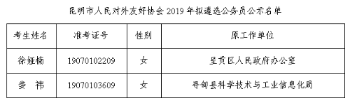 根据《昆明市2019年市级机关公开遴选公务员(参公管理人员)公告》有关规定,经笔试、面试、考察和体检等程序,昆明市人民对外友好协会拟遴选徐娅楠等2名同志,现进行公示。人选情况见附件。