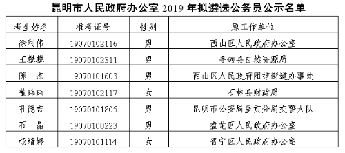昆明市人民政府办公室2019年拟遴选公务员人选公示