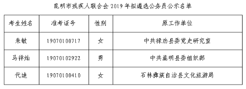 昆明市残疾人联合会 2019年拟遴选公务员人选公示