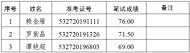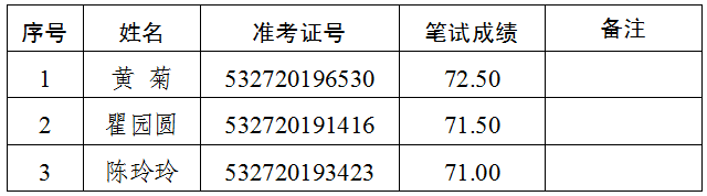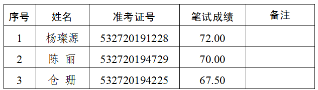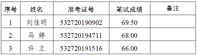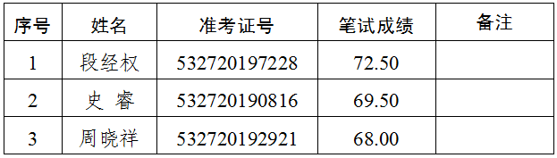 2.递补情况:报考综合文秘岗位(岗位代码A004004),准考证号码532720194322号的考生,笔试成绩69.50分,该岗位排名并列第一。经再次资格审核,该考生不符合遴选岗位要求,取消面试及后续的遴选程序。按照普洱市中级人民法院2019年公开遴选公务员公告(第1号),递补该岗位第四名考生(准考证号:532720191516)进入面试。