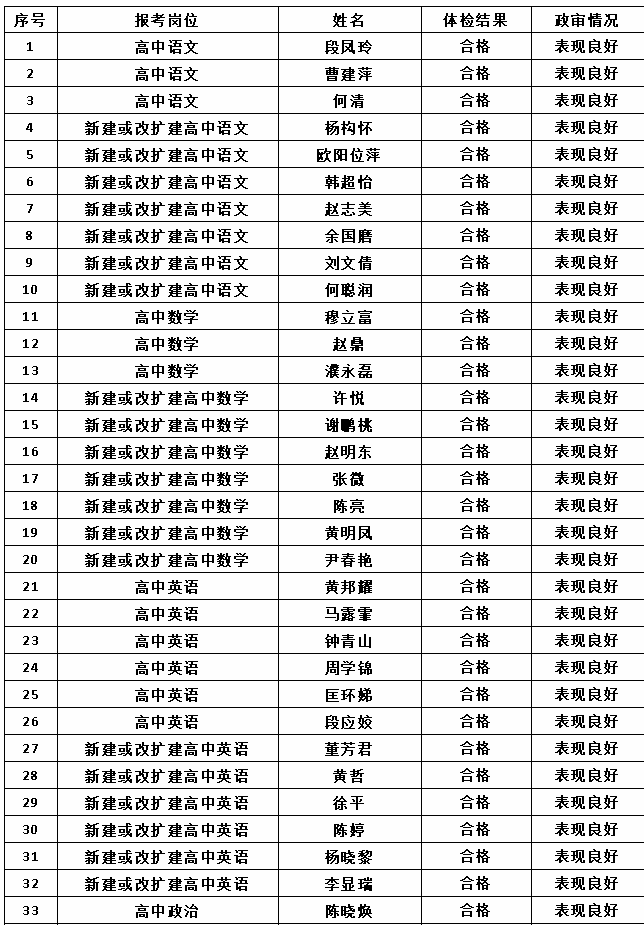 根据《关于印发〈云南省应对新冠肺炎影响大幅增加名额面向全国开展基础教育学校和医疗卫生机构专项招聘优秀高校毕业生工作方案〉的通知》(云人社发〔2020〕22号)要求,按照程序,现将报考龙陵县2020年“专项招聘”教师拟录人员体检、考察情况公示如下: