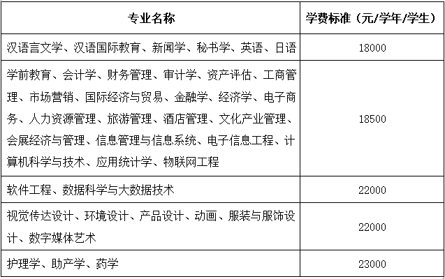 【普通类】汉语言文学、汉语国际教育、新闻学、秘书学、学前教育、英语、日语、会计学、财务管理、审计学、资产评估、工商管理、市场营销、国际经济与贸易、金融学、经济学、电子商务、人力资源管理、旅游管理、酒店管理、文化产业管理、会展经济与管理、信息管理与信息系统、电子信息工程、计算机科学与技术、应用统计学、软件工程、数据科学与大数据技术、物联网工程、护理学、助产学、药学。