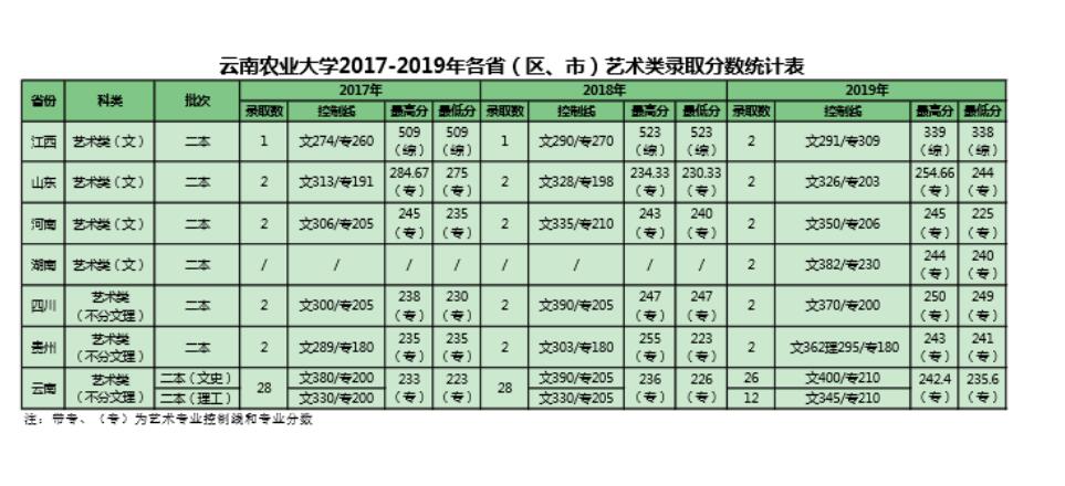 云南农业大学2017-2019年各省(区、市)艺术类录取分数统计