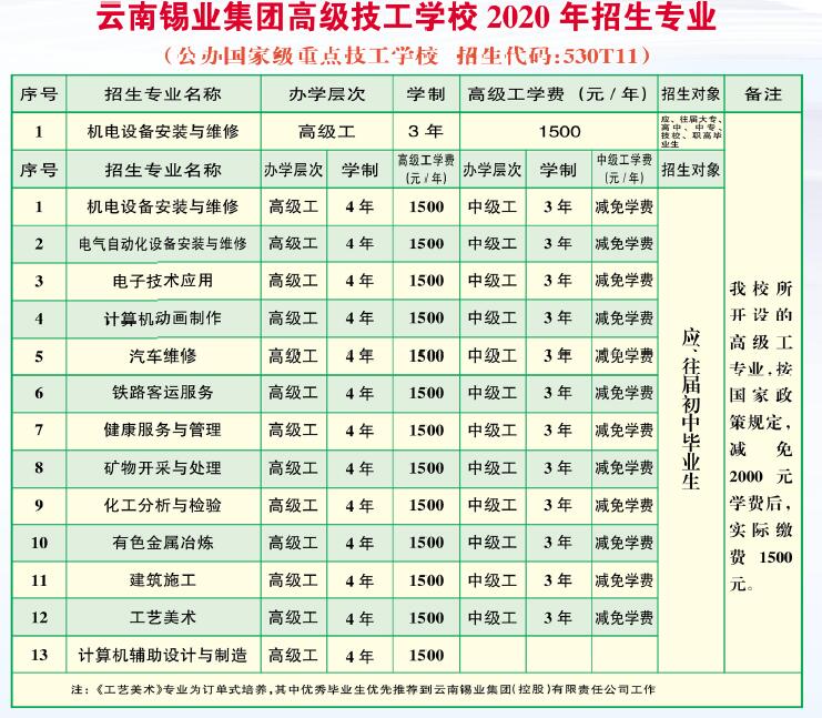 云南锡业集团高级技工学校2020年招生专业
